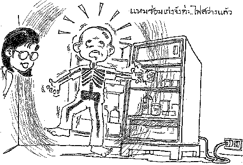ท่านน่าจะรีบไฟซื้อดวงไฟดวงใหม่มาเปลี่ยนเสีย เพราะตู้เย็นเป็นจุด อันตรายเรื่องไฟฟ้าที่หนึ่ง เพราะทั้งชื้น และเราก็ใช้บ่อยมาก ถ้าหากท่านไม่สามารถ หาซื้อดวงไฟใหม่มาได้ แนะนำว่า ท่านอย่าไปถอด ดวงไฟ ดวงนั้นออก (ปล่อยให้ดับ เอาไว้อย่างนั้น) เพราะถ้าท่านปลดดวงไฟออก ความชื้นก็จะวิ่งเข้าไป สู่ขั้วหลอด แล้ว ก็จะสร้างโอกาสให้กระแสไฟฟ้า วิ่งเข้าสู่ตัวท่าน และบุคคลที่ท่านรักได้ง่ายขึ้น