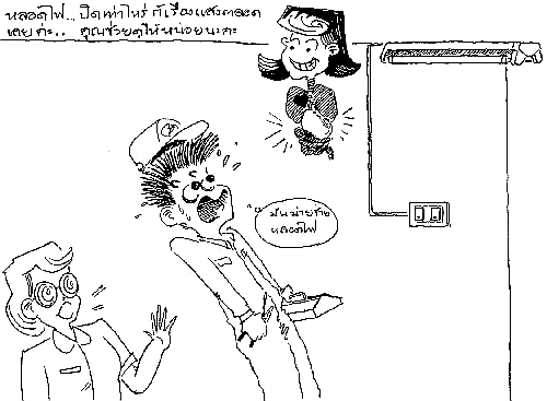 เหตุที่เกิดนี้เกิดขึ้นได้ ๒ ประการ คือ ประการแรกเป็นปัญหาเทคนิคนิด หน่อย ซึ่งเกิดจากการเดินสายไฟ ผิดพลาด แทนที่จะเอาสายกระแสต่อเข้าสวิตช์ก่อน แล้วจึงเดินไปที่ดวงโคม เขาดันเอาสายกระแสนั้น เดินไปที่ดวงโคมก่อนแล้วค่อย เดินไปที่สวิตช์ (สายไฟทั่วไปจะมีสองสาย คือ สายกระแสและสายศูนย์ หากมีสายที่ สามก็คือ สายดิน) ดังนั้น เมื่อท่านดับสวิตช์ไฟ กระแสไฟก็ยังคงเดินไปตามสาย กระแสเพื่อเลี้ยงหลอดไฟอยู่ หลอดไฟจึงดูเรืองแสงอยู่ การแก้ไขสำหรับท่านผู้ไม่ ค่อยทราบเรื่องไฟฟ้า คงจะต้องรบกวนช่างไฟฟ้าผู้รู้เรื่องมาจัดการแก้ไขการเดินสาย นั้น และน่าจะต้องรีบแก้ไขด้วยครับ เพราะนอกจากเราจะต้องจ่ายค่ากระแสไฟฟ้าไป โดยเปล่าประโยชน์แล้ว ก็ยังอาจจะเป็นอันตราย กับชีวิตและทรัพย์สินของเราด้วย ครับ