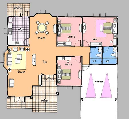 บ้านชั้นเดียว ขนาดใหญ่ ในราคาที่ไม่สูงเกินไป เพียบพร้อมด้วยประโยชน์ใช้สอย มี 3 ห้องนอน 2 ห้องน้ำ พร้อมที่จอดรถ 2 คัน มีห้องนอนใหญ่ที่กว้างขวาง พร้อมห้องน้ำในตัว รูปทรงภายนอกสวยงาม โดดเด่น เน้นทางเข้าด้วยเฉลียงด้านหน้าขนาดใหญ่ สร้างความรู้สึกเชื้อเชิญ ต่อเนื่องกับส่วนอเนกประสงค์ขนาดใหญ่ ซึ่งเป็นห้องเปิดโล่ง จัดเป็นส่วนรับแขกและทานอาหาร แยกเป็นสัดส่วน โดยมีโถงกลางเชื่อม สามารถจัดวางเฟอร์นิเจอร์ แบ่งส่วนการใช้สอย ได้อย่างเหมาะสม สร้างความรู้สึกโปร่งสบาย ในบรรยากาศ ที่เป็นกันเอง มีครัวที่ต่อเนื่อง กับส่วนทานอาหาร และส่วนซักล้าง สามารถดัดแปลง ต่อเติมขยายพื้นที่ใช้สอยในส่วนต่างๆ เช่น ห้องนอน ห้องทานอาหาร สำหรับการขยายตัวในอนาคตได้ - เฉลียงทางเข้าขนาดใหญ่ ( ขนาด 3.50 x 3.80 ม.) ติดกับส่วนจอดรถ - ห้องรับแขกขนาดใหญ่ โปร่งสบาย ( ขนาด 6.00 x 5.50 ม.) ออกเฉลียงภายนอกได้ - ห้องอาหารขนาดใหญ่ ( ขนาด 4.00 x 4.00 ม.) มี Bay Window - ห้องนอนใหญ่ ( ขนาด 4.00 x 5.00 ม.) มีห้องน้ำในตัว - ห้องนอน 2 ( ขนาด 3.50 x 4.00 ม.) - ห้องนอน 3 ( ขนาด 3.50 x 4.00 ม.) - ห้องโถงขนาดใหญ่ - ห้องครัว แยก เป็นสัดส่วน ( ขนาด 3.00 x 4.00 ม.) - ห้องน้ำของห้องนอนใหญ่ ( ขนาด 2.00 x 2.40 ม.)่ มีสุขภัณฑ์ครบชุด - ห้องน้ำสำหรับแขก ( ขนาด 1.60 x 2.40 ม.) มีสุขภัณฑ์ครบชุด - ลานซักล้าง และตากผ้า ( ขนาด 1.60 x 3.20 ม.) - ที่จอดรถ 2 คัน ( ขนาด 5.00 x 5.00 ม.) ท่านสามารถนำแบบไปปลูกสร้างบ้านได้ทันที