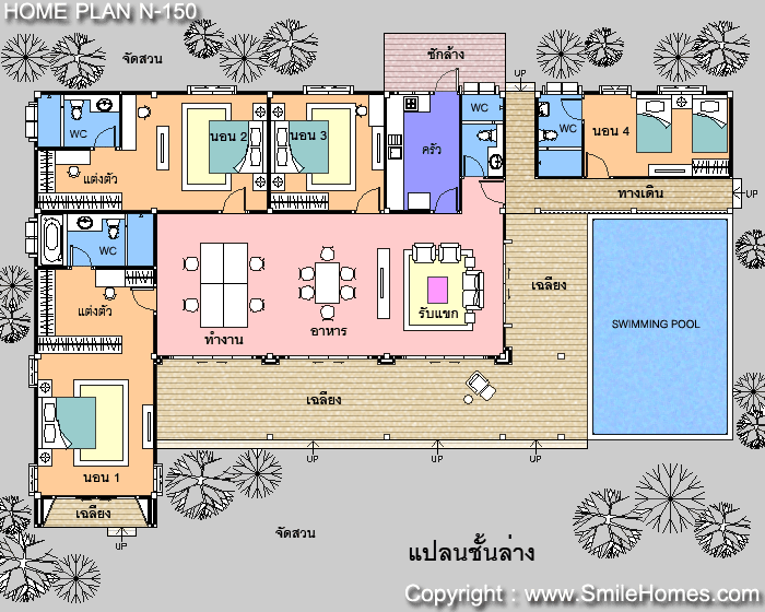 แบบชุดมาตรฐานจะไม่มีสระว่ายน้ำ ถ้าต้องการแบบพิมพ์เขียวรายละเอียดสระว่ายน้ำ คิดค่าแบบเพิ่ม 20,000 บาท