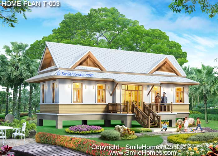สไตล์ไทยประยุกต์ เน้นทางเข้าบ้าน ด้วยบันไดทางขึ้นบ้าน เป็นเฉลียงนั่งเล่น นอกชานขนาดใหญ่ ภายในเป็น ห้องโถงอเนกประสงค์แบบโปร่งโล่ง ใช้เป็นส่วนรับแขก หรือนั่งเล่น ส่วนทานอาหาร มีห้องครัวเป็นสัดส่วน มีห้องนอนขนาดกลาง 2 ห้อง และห้องน้ำส่วนกลางที่มีสุขภัณฑ์ครบชุด