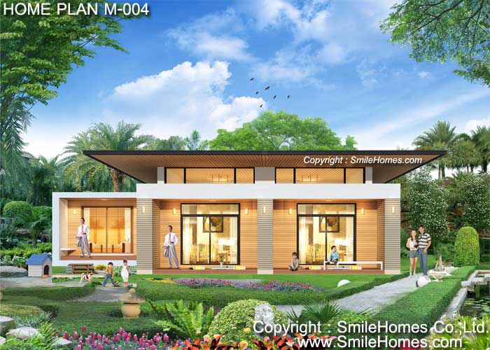บ้านสไตล์ Modern เป็นแบบบ้านอยู่สบาย ใกล้ชิดธรรมชาติ เน้นการประหยัดพลังงาน เป็นบ้านเล่นระดับ ด้านหน้ายกระดับจากพื้นดิน 0.50 ม. ห้องนอนยกระดับจากพื้นดิน 1.00 ม. ใช้เป็นบ้านพักอาศัย, เป็น Home Office, เป็นเรือนพักผ่อนในสวน, เรือนริมน้ำ, เรือนรับรอง หรือทำเป็น Resort สำหรับให้เช่าได้ : เป็นบ้านชั้นเดียว มี 2 ห้องนอน 1 ห้องน้ำ รูปทรงภายนอกเป็นสไตล์ Modern ดูทันสมัย สวยงาม หลังคาเป็น Metal Sheet ที่มีช่องแสง Sky-Light ด้านบน ด้านหน้าเป็นเฉลียงนั่งเล่น ภายในเป็นส่วนโถงรับแขก ห้องอาหาร มีห้องนอนด้านหน้า 1 ห้อง และเฉลียงส่วนตัว มีห้องนอนด้านใน เล่นระดับ ยกพื้นสูง ด้านหลังมีส่วนเตรียมอาหาร Pantry และห้องน้ำ ห้องเก็บของ พร้อมส่วนซักล้างด้านหลัง ที่ใช้เป็นส่วนครัวไทยได้ ชั้นล่าง หลังคา